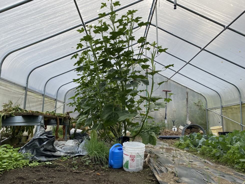 Ten foot okra plants in the high tunnel. It is still summer in here...outside, These would've succumbed to disease by now, but in here they look perfect and flawless.. I am mainly growing these for a seed crop.