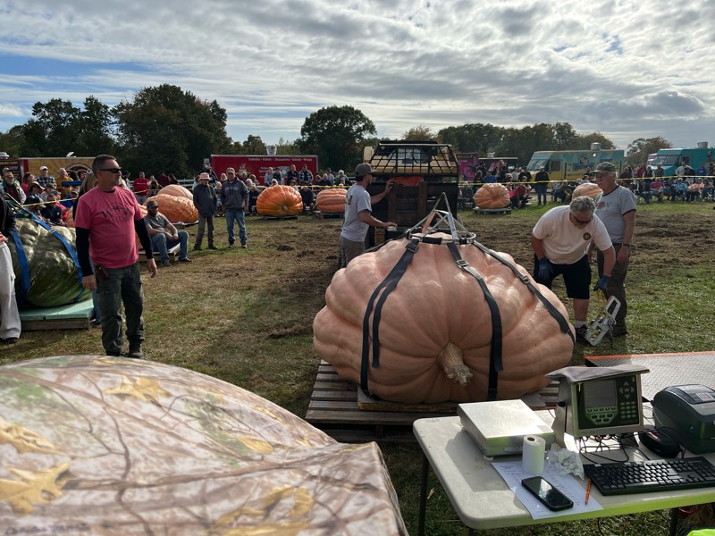 Gene looks on as his pumpkin is prepared for its trip to the scale.