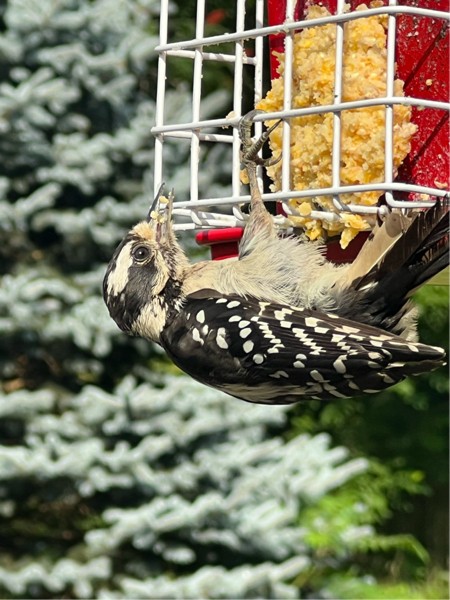 One of my favorite stories I'll ever tell.this is Wendy.she's a young downy woodpecker that got caught in the greenhouse. Tried to get her to fly out for a half hour. Long story short, the bird had to trust me and fly toward me when I had the end of the greenhouse open. She did.. and landed on the step ladder i had set up, right outside the doors. I became her hero that day. I could tell by the look in her eyes.