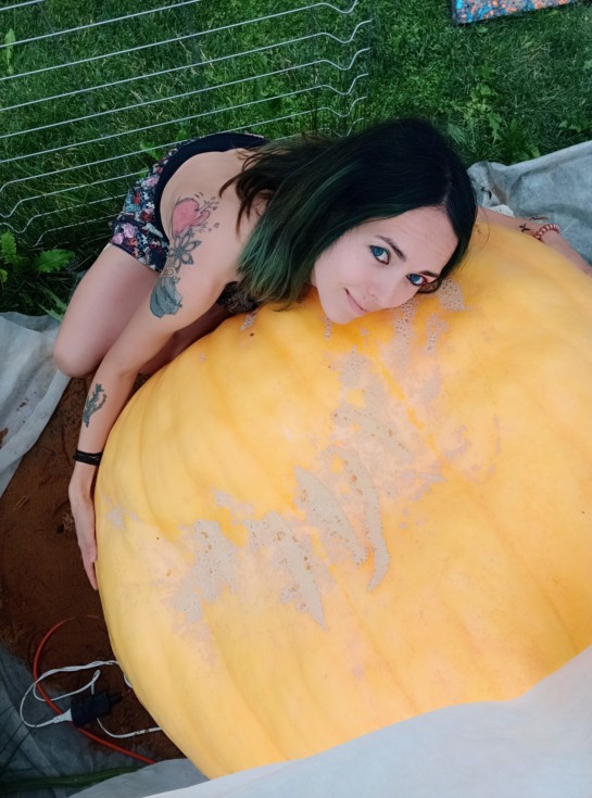 July. The weather improved. It still rained, but it got warmer. I really wanted my pumpkin to be orange, and in July it became clear it definitely wouldn't be white. It would be orange. I went on a short vacation. My brother and his wife watered Gorky Park while I was away. When I returned, the pumpkin was already 184 kg (DAP 44). 100 kg in a week - for me, that was still something incredible. The orange color turned�a beautiful�shade�of�pink. It was a very beautiful color, like a peach. Finally, normal summer weather arrived, with temperatures around +28°C. This contributed to good growth. At DAP 50, the pumpkin was 250 kg. The color of the pumpkin became more and more beautiful; people started saying that they wanted seeds from my pumpkin. It was very nice to hear. At DAP 60, the pumpkin was 311 kg. Although at that age it should have been growing more slowly, it grew well. I constantly had to redo the shelter from rain and sun because it needed to be made bigger and bigger.