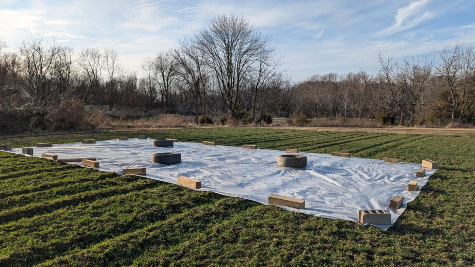 It seems that every spring we struggle with excessive moisture, getting the ground really fit to till often doesn't happen until May or the beginning of June. Last year I tilled when it was too wet which resulted in cloddy soil and a layer of compaction at the bottom of the tilling depth. The last 10 days or so have been dryer than average and the ground is starting to dry out. Unfortunately the Ag Weather (ag-wx.com) maps that I follow show us in above average precipitation for the next 4 weeks. I put down a 20ftx40ft piece of 6 mil plastic to cover the central area of the patch where the hoop houses will go and a little area beyond that. I plan to keep it covered on rainy days and uncover on dry days. Hopefully by about the beginning of April I can have a nice dry area to broadfork then till before I bury my heating cables and put up the hoop houses.