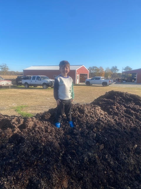 11-16-2025 compost starting to look like compost should. 5 weeks and about 12 flips in the project. Had some good help hosing it down today. those blue shoes went home dirty enough that granddad got in in trouble.