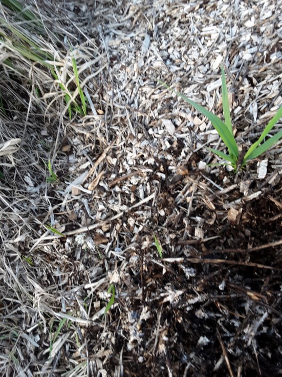Small budget gardening (free). It's sometimes difficult to know if an amendment will help or not. In this case the wood in the middle of the pile has finally decomposed enough to show a positive affect on the growth of the grass in the middle of the pile. But the grass around the edges is not showing any improved growth. Well, undecomposed wood chips aren't a good source of nutrients. But I do think some nutrient release is happening where the white fungal growth is, in the center of the pile.