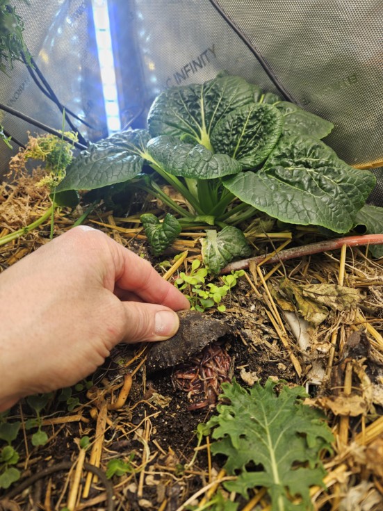 garden lettuce is so tasty indoors. no bugs, just lots off red wigglers. They love avocado domes for boom-boom buffets.