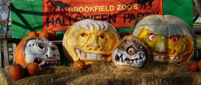 4 giant pumpkins carved by Steve Dahlke at the Brookfield Zoo located 14 miles west of Downtown Chicago. The large green-er fruit to the right is the 1066 Barlow 2004, which is the new WI state record squash (dang pumpkins turning green!) I believe the smaller carved fruit belong to Dave Creuzinger and the big middle fruit is the 857.5 Neuville 2004.