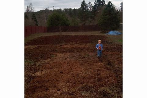The farthest spot that shows the dark dirt is the newest section tilled.