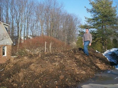 This is about 40 yards of composted potting soil. I got it from a greenhouse grower that I know. I couldn't dump it in the patch because the lawn was too wet to drive the dump truck on. Oh, well, I'll have fun using my new tractor! Yup, that's me standing on the pile.