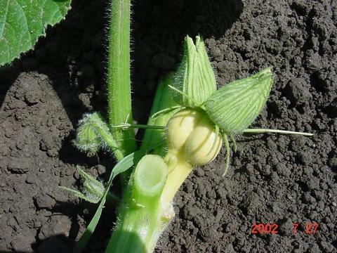This Siamese pumpkin is on the 707 Toftness plant and has 2 flowers, two pumpkins (attached together) and 1 stem.