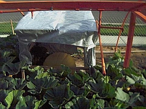 Here is a shot of my newly constructed pumpkin hut for the pumpkin I set on the 644 main. The pumpkin is 21 days old today. Momma doesn't like my hut, she says it makes the garden look "Dumpy" I laughed when she called my "Hill Billy Pumpkin Hut".
