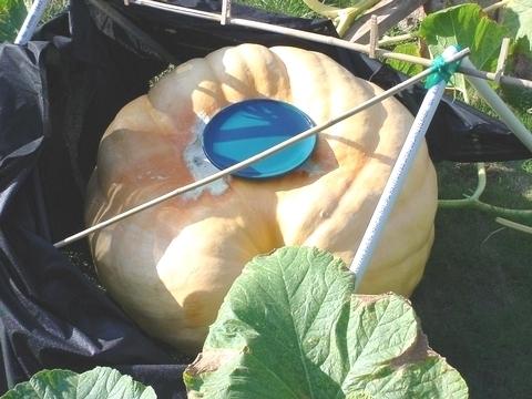 Just a picture of the big gal. She was estimates at 235# (OTT) on 1/AUG/02. The sticks around her are for the shadecloth tent, which was removed for the picture. If I can keep the powdery mildew in check, I should have a wopper by october.