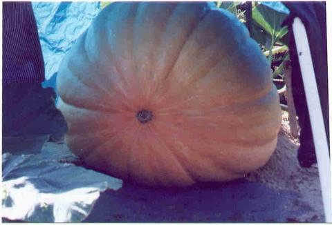 Picture was taken around 8-15-02. The pumpkin now weighs in the high 500 range. Has taken on many of the traits of the 995. With the weather conditions its a wonder anything grew this year!