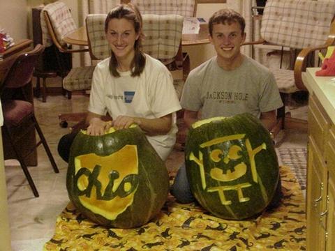 well it was FREEZING last night so we brought in a few more squash to carve INSIDE. my mom seemed stressed about the mess. :) i did mine as an ohio bicentennial pumpkin and nick did his as sponge bob (a request from one of the millions of 16 yr olds at our house last night...my sis's obnoxious friends). i was impressed as were they.
