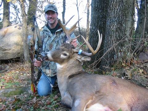 Here's a buck I shot with my bow on Saturday 11-2-02. It's a 9 pointer with a 18 3/4 inch inside spread. The rack scores 143 and he field dressed 183 lbs. Although this isn't my biggest buck, it is very special because I shot it only 300 yards from my house. I thank the Good Lord for this buck.