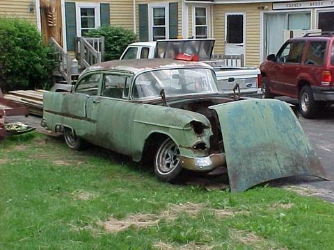 this 55 was found in western N.H somewhere,bought for parts for 100 $ trailered home randy will strip off what parts he needs for his other 55,tow it to his front lawn and plant flowers in it,Modern art i think they call it!