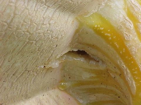 after getting almost 3" of rain last night,found these two splits,they dont go all the way through,but it dosent look good,hopeing 1 of the 2 i pollinated to replace this wreck will grow a little faster then this one did.