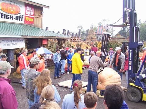 Joe Pukos being interviewed as workers hook the harness to his pumpkin. Weighed in at 851 lbs.