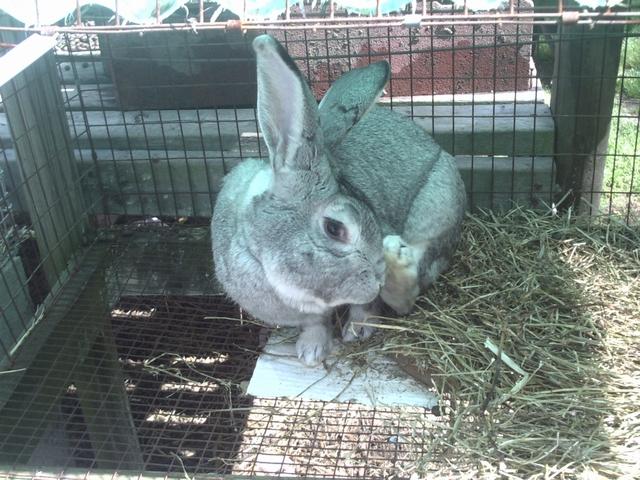 here is a pic of big blue,he is my male breeder,he just fatherd 14 babys from one doe,and 9 from another,he is producing some nice looking rabitts,i have put out in the garden around 1/4 truck load of rabitt manure so far,i am going to put a fence around the garden this fall,seperate the bucks from the does,build a small shed to get out of the weather,and let them go,i have around 60 rabitts so far.