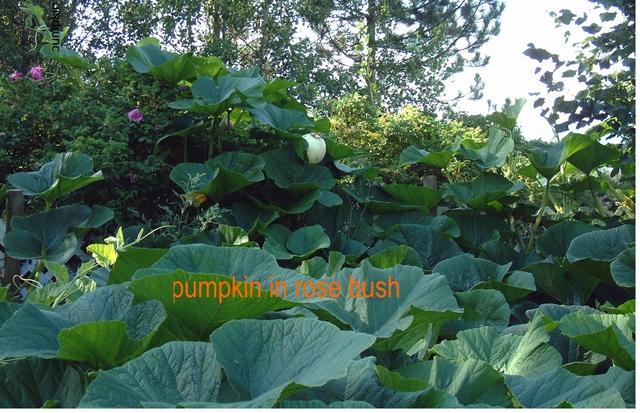 Only in Nova Scotia would you find a patch so bad that an escapee vine overgrew a large rosebush and produced what is possibly the highest pumpkin of 2004 !