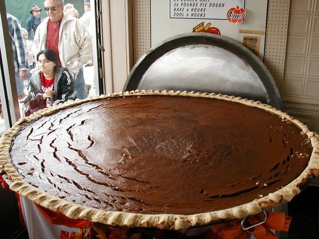 Well due to some kids wanting to upstage Circleville they had to increase the yearly pie. This one is 6 feet across & weighs 400 lbs. Now remember that some of these "giant pies" you read about are baked outside with propane heaters. Circleville's pie is baked inside a real oven & taste like a real pumpkin pie.
