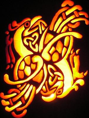 Designed based on the Book of Kells. This is the carving that originally smashed to bits in the sink. Here it is re-carved on a 30 pound pumpkin.