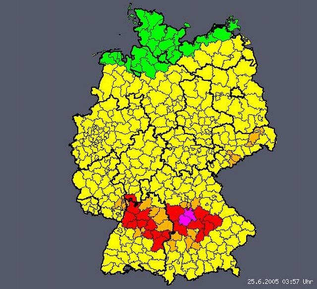 Here is a graphic diagram of the "Unwetterzentrale". I downloaded it last night during the thunderstorm. Our "Landkreis Roth" is the slightly longer one of the two purple coloured ones. Purple is the highest alert level. Looks like they were right...