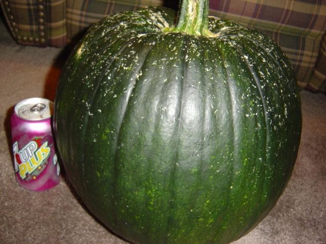 A marrow seedlings self-sown in my garden when I turned it over; so I just let them grow. The plant became pretty large and had typical marrow shaped leaves. The female flowers started to produce perfectly round, and bright yellow fruits. I had a pumpkin out front the year before for halloween, and thought that maybe a seed somehow got into the garden. I was surprised when they matured into round marrows that look very pumpkin like. I cut one open just to make sure it was a marrow. This marrow is 36 inches around and weighs around 20-25 pounds (using fish scale).