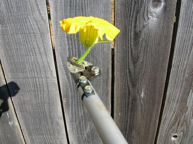 This long reach pruner has saved me many hours of work in the patch this year. It gets my vote for "tool-of-the year". It is 5 feet long and will cut and hold the male blossoms. I have removed hundreds of males with very little bending over. Its easy on your back........and quick......and you compact the soil less by not walking as far in the patch.