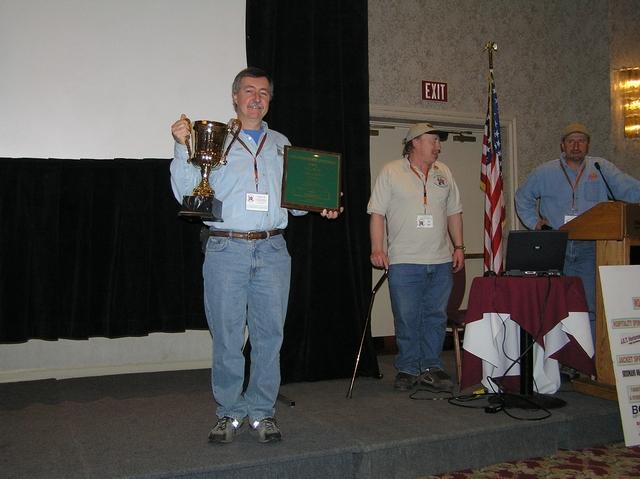 Joe Jutras proudly display, trophy and Plaque for winning GPC Long Gourd competition with his 126.5" World Record Gourd. at GVGO seminar