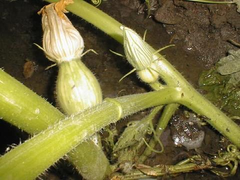 The two test pumpkins we planted from seed that came from a pumpkin we grew last year are doing well. the female on the left is from one plant and the one on the right is from the other, I can see a problem hapening here.