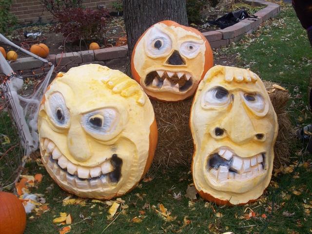 these three pumpkins were created on halloween middle pumpkin pressing its hand on the two larger pumpkins