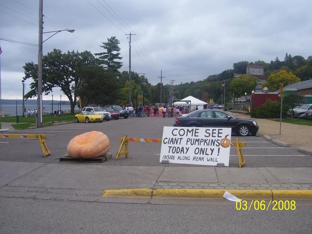 Giant Pumpkin and sign at entrance of stillwater weigh-off