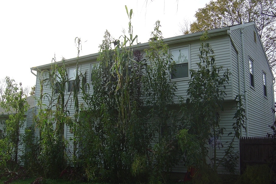 Everything is pretty much finished along the back. Waiting for all seeds to mature before I cut everything down and measure it. All the amaranth seemed to have topped out. The one corn that looks really tall is just hanging outward toward me; so it's about the same height as the others.