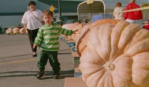 Under his mother's watchful eye, a potential future grower marvels at all the pumpkins lined up in the 200-400 pound class.