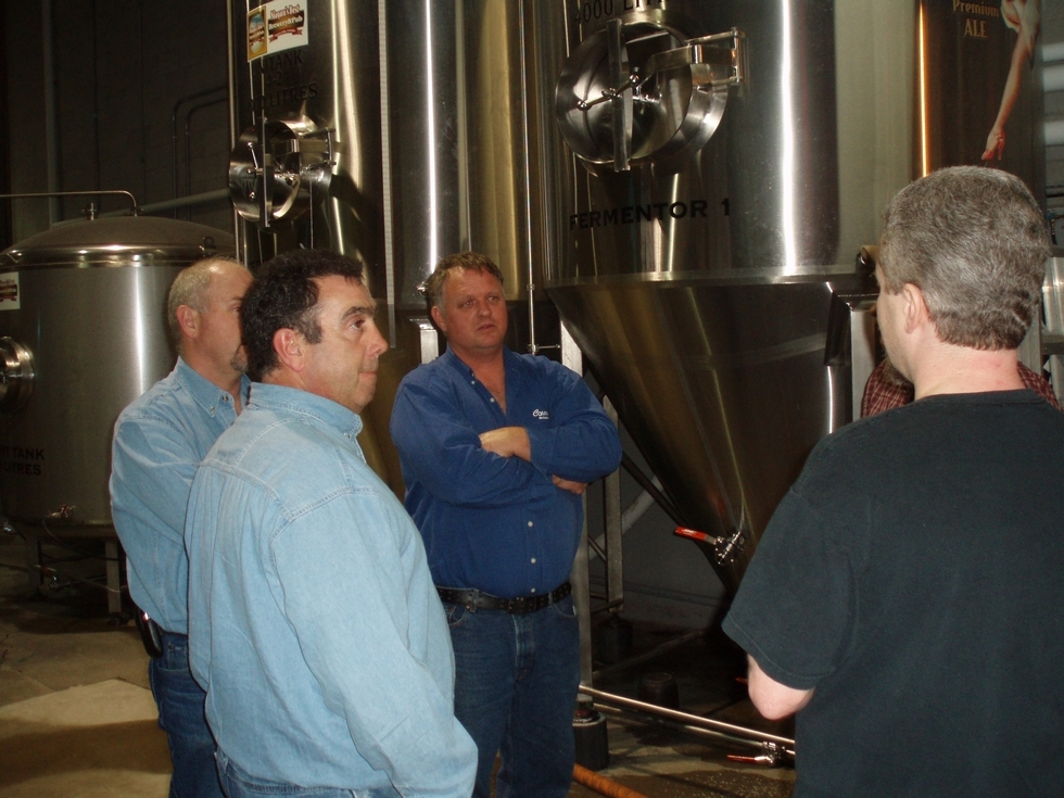 Ian is teaching Dave Stelts, Jim Sherwood and Don Young the finer points of making beer.