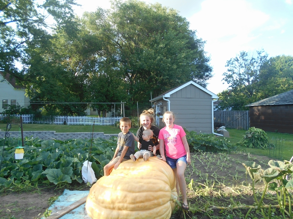 a new grand son was added this year and it is his 1st pumpkin, It was taping just shy of 1200 august 11th when it split and 2 inches at the blossom all done for the year just a bushel gourd left.
