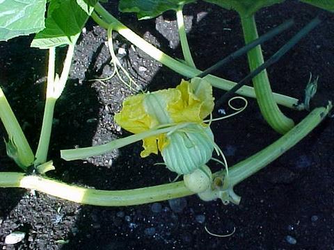 This is one of many ways to keep the bugs and moisture from a freshly pollinated female. A snipped off, long tendril works in a pinch when "you know who" did not bring a piece of twine or nylon stocking out to the patch with her this morning. Just wanted to share this with you guys. The leaf that hangs over the female will also act as an umbrella to keep water out when over head irrigattion is running. The leaf is held back for photographing with a bamboo stake.