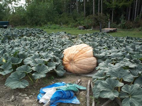 The pumpkin pictured here is estimated at 502 pounds and is growing on a 1009.5 Eaton plant. Len waters his pumpkins by hand with a hose. The water is pumped from a pond he has on his farm. In the background you can see the two scales Len has setup for weighing his pumpkins and squash.