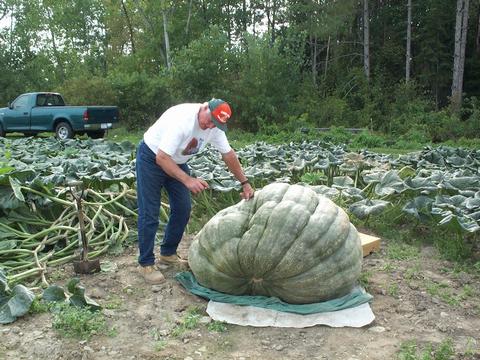 On the day of our visit this squash, grown on the 895.5 Hester, was taping at an estimated weight of 840 pounds. Len is showing us where the squash went down with a rib split on a dill ring. Sorry Len.
