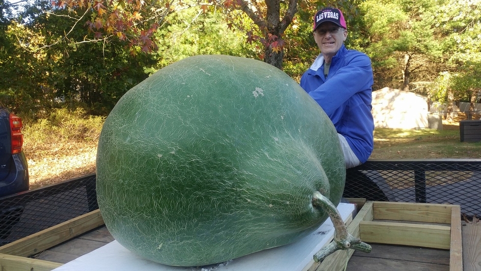 Steve Connolly with his massive 470.5 bushel gourd loaded and ready for the weigh-off.